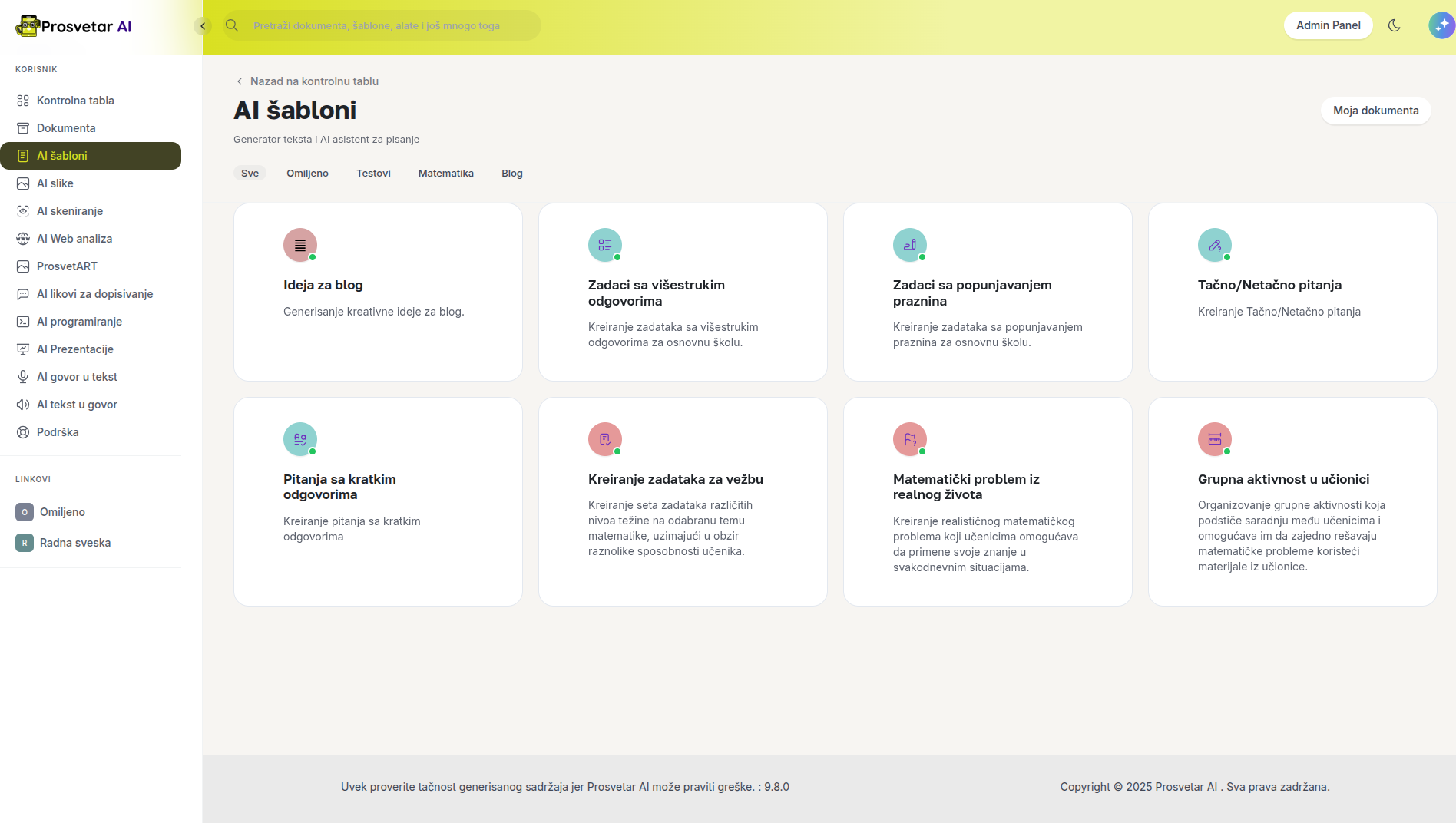 Jedna od centralnih funkcionalnosti Prosvetar AI aplikacije jeste sistem inteligentnih šablona, koji omogućava generisanje sadržaja na osnovu jasno definisanih parametara kao što su predmet, razred, oblast, nivo težine i ishodi učenja. Nastavnici mogu da kreiraju testove sa različitim tipovima zadataka, pripreme za čas, domaće zadatke i evaluacione materijale, uz mogućnost dodatnog prilagođavanja i uređivanja generisanog sadržaja u skladu sa potrebama učenika.